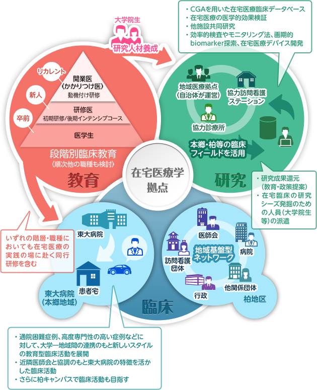 東京大学では、研究・教育・臨床の3領域の活動を展開する医学部在宅医療学拠点を設置し、在宅医療に対応できる優れた人材の養成を行います。